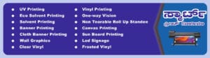 We offer digital, offset, flex, vinyl, brochure, flyer, and visiting card printing.